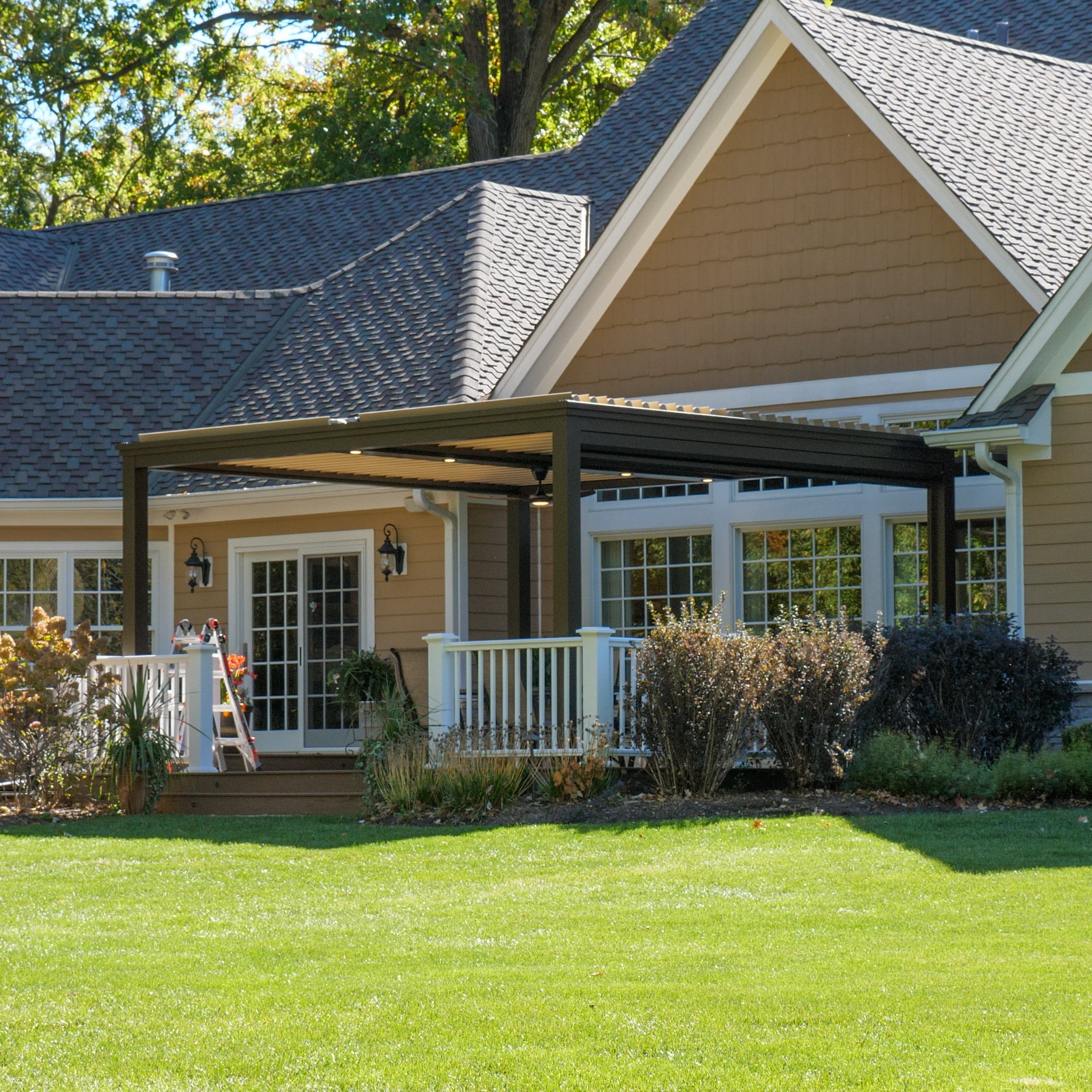 We designed a stunning bronze TitanCover louvered pergola in Chicago, featuring integrated pot lights and a ceiling fan for added comfort. This modern structure perfectly blends aesthetics with functionality, enhancing outdoor living while maintaining an inviting atmosphere. The inclusion of a Phantom screen offers privacy and protection from the elements, making it a versatile space for relaxation.