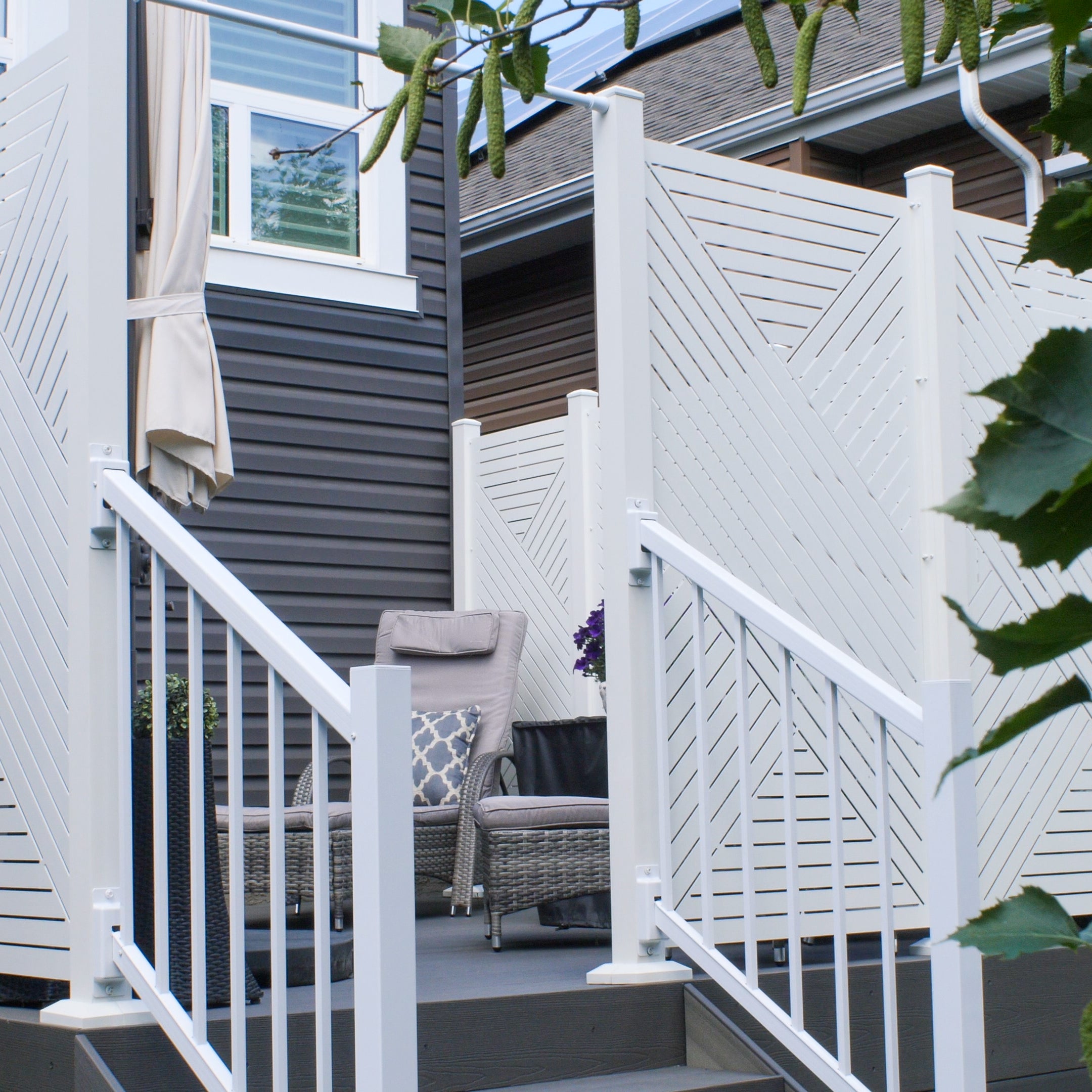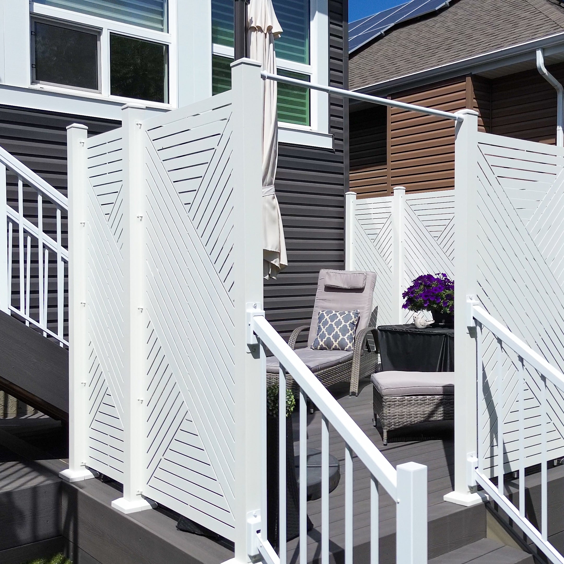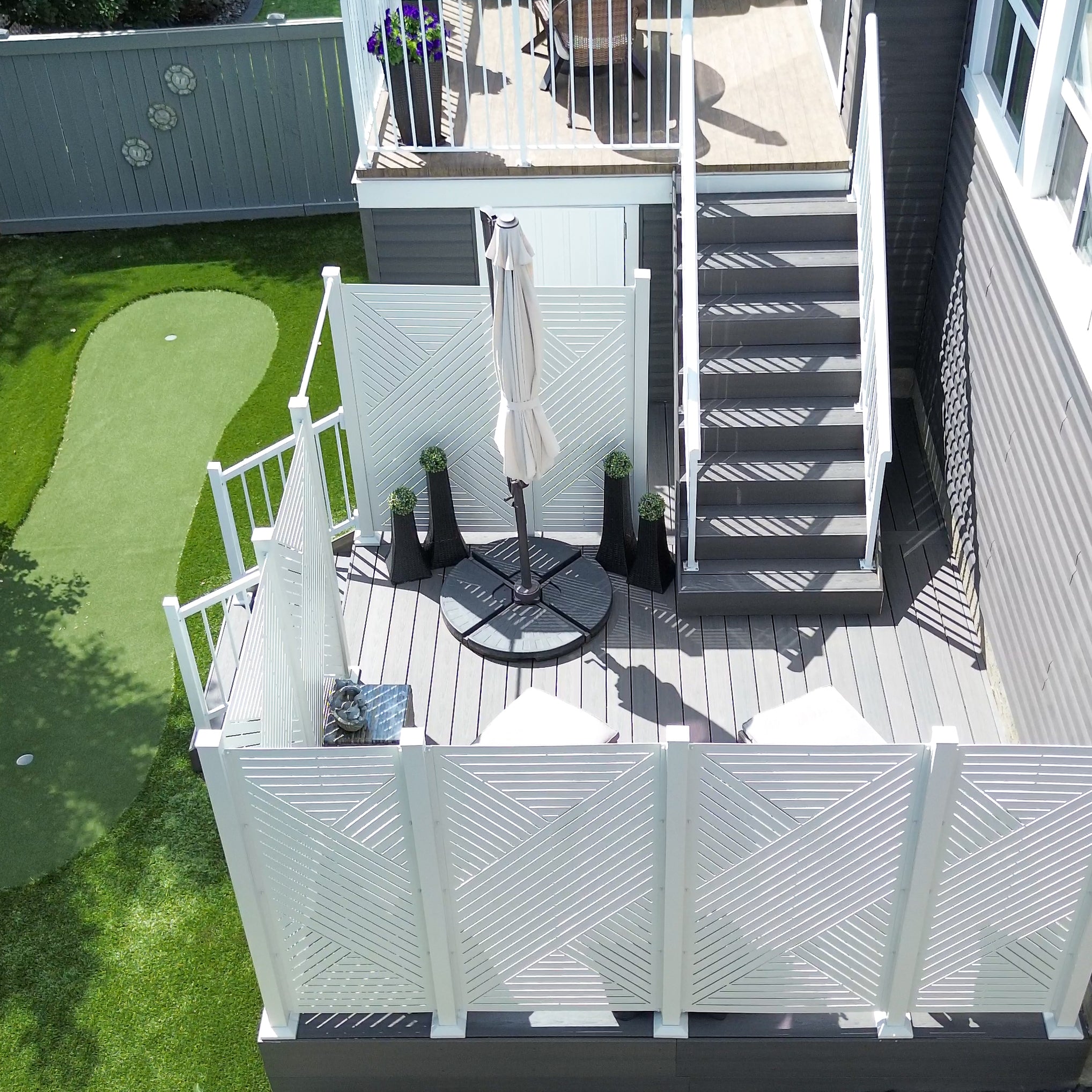This two-story deck was elevated to new levels of sophistication with the installation of sleek white Hexx privacy screens. These screens are designed to provide the perfect blend of seclusion and openness, effectively blocking views from the walking trail behind the home while still allowing the homeowners to enjoy their outdoor space. The crisp white panels offer a modern and clean aesthetic that enhances the deck's overall appearance, creating a stylish barrier without compromising the inviting and airy atmosphere of the space.